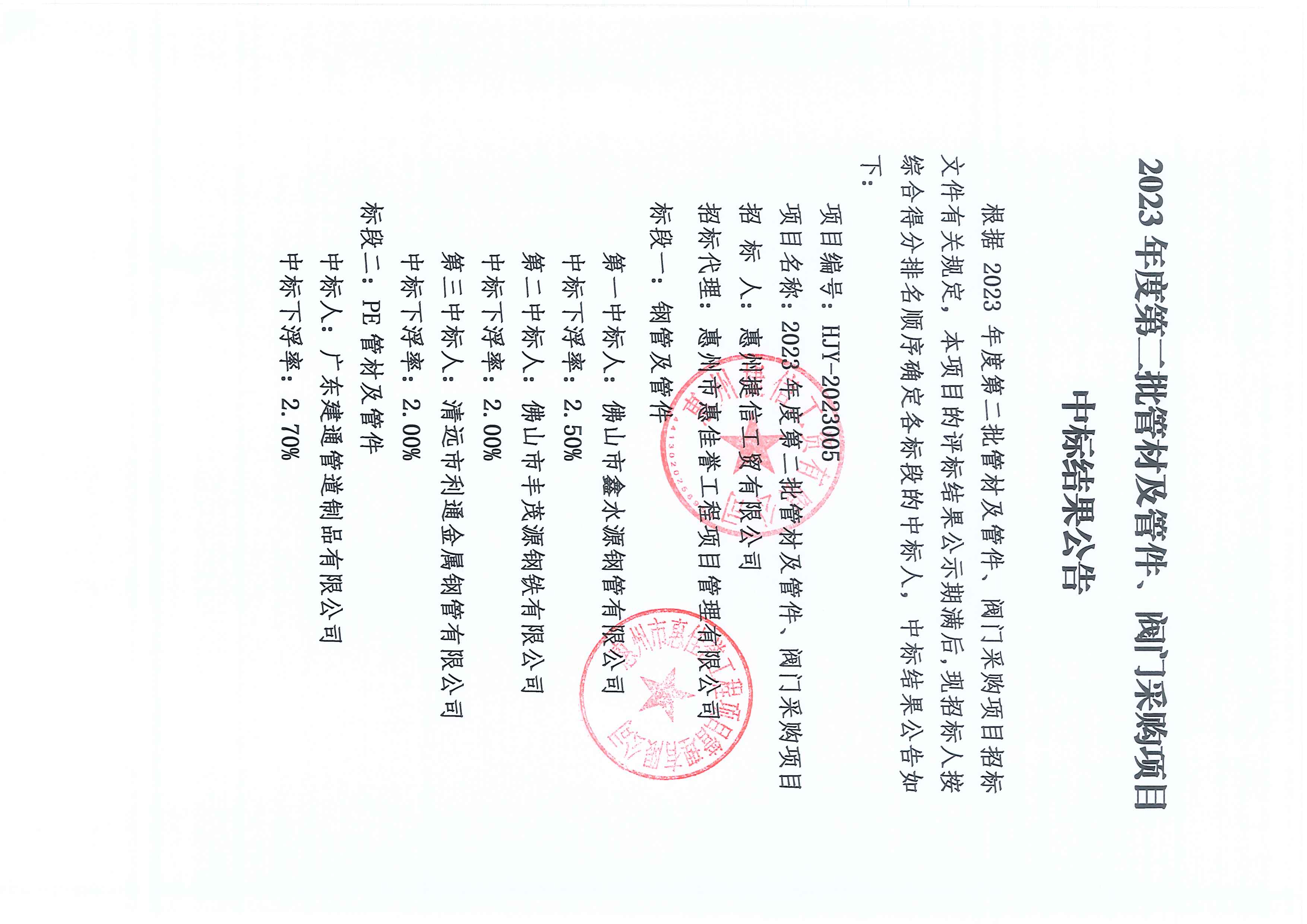 捷信工貿(mào)公司2023年度第二批管材及管件、閥門采購項目中標結(jié)果公告