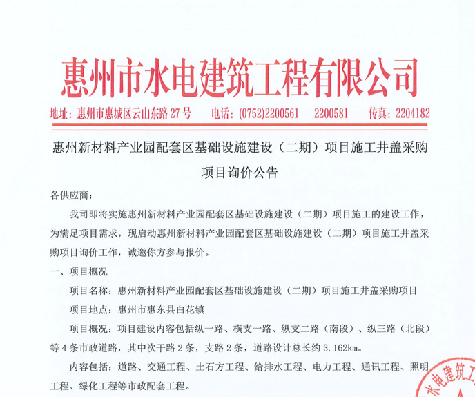 惠州新材料產業園配套區基礎設施建設(二期)項目施工井蓋采購項目詢價公告......