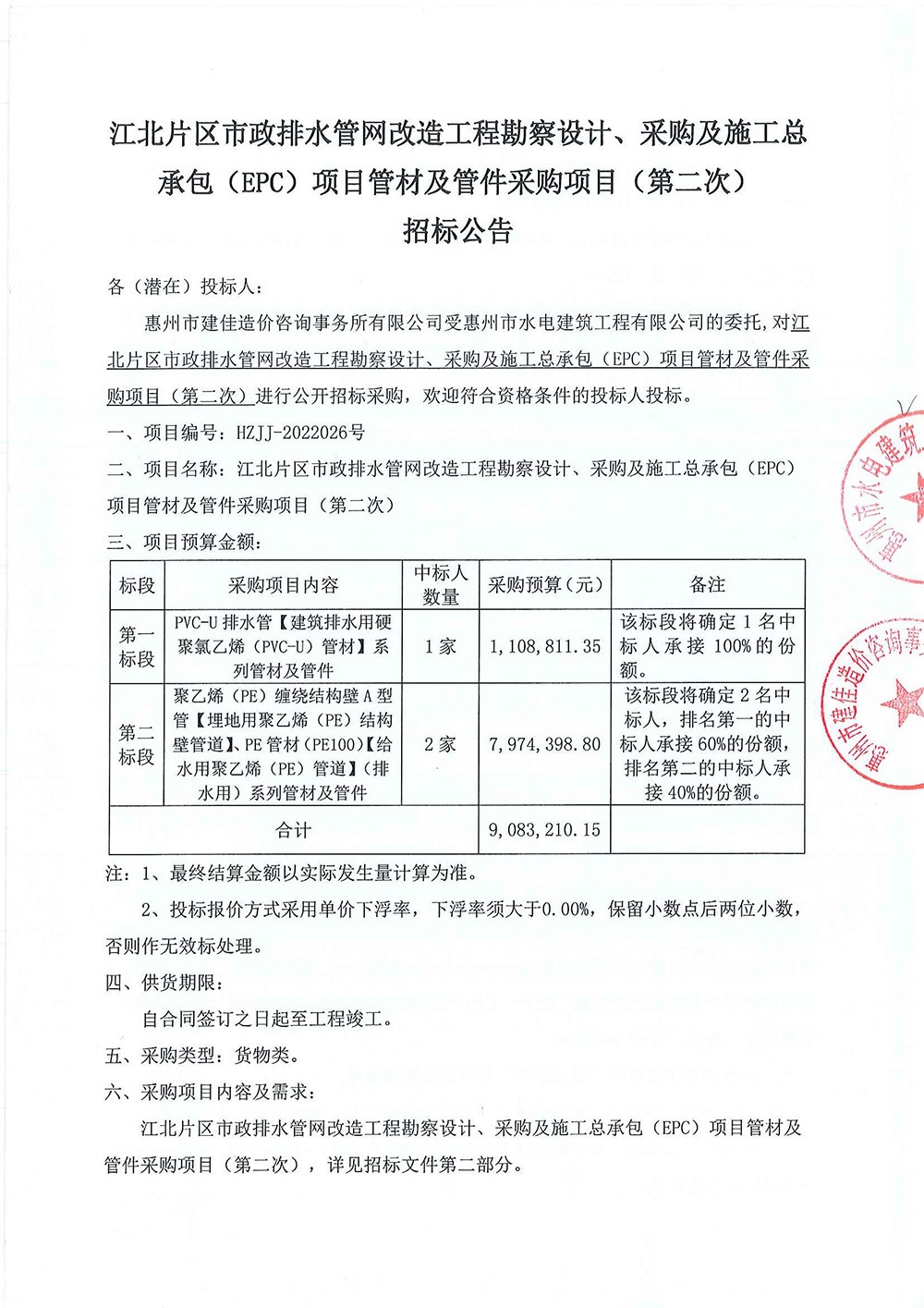 2023年度第一批管材及管件采購項目招標公告惠州市建佳造價咨詢事務所有限公司受惠州捷信工貿有限公司的委托,對2023年度第一批管材及管件采購項目進行公開招標采購,歡迎符合資格條件的投標人投標。一、項目基本情況1、項目編號:HZJJ-2022198號2、項目名稱:2023年度第一批管材…......