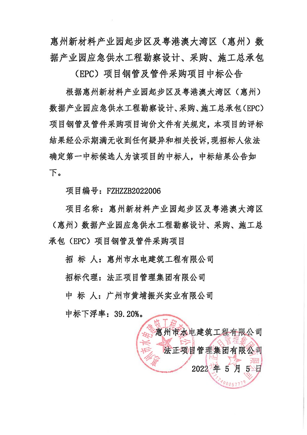 惠州新材料產業園起步區及粵港澳大灣區(惠州)數據產業園應急供水工程勘察設計、采購、施工總承包(EPC)項目鋼管及管件采購項目中標公告