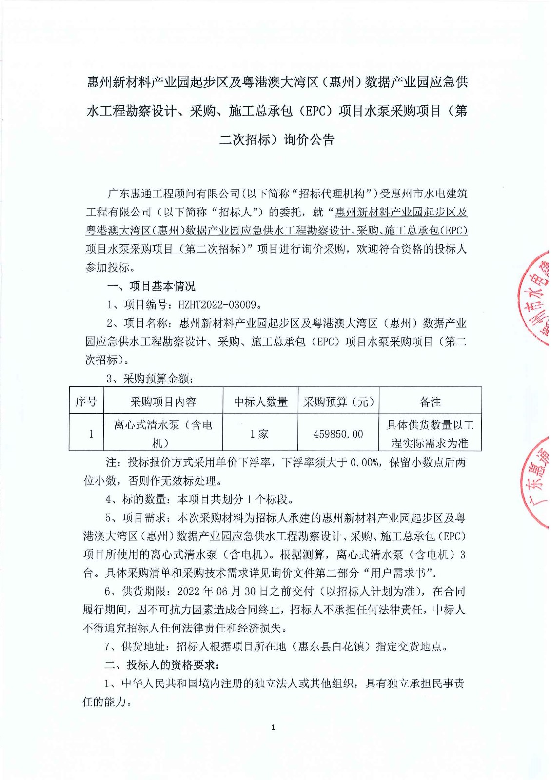 惠州新材料產業園起步區及粵港澳大灣區(惠州)數據產業園應急供水工程勘察設計、采購、施工總承包(EPC)項目水泵采購項目(第二次招標)詢價公告
