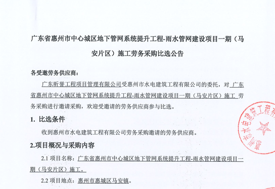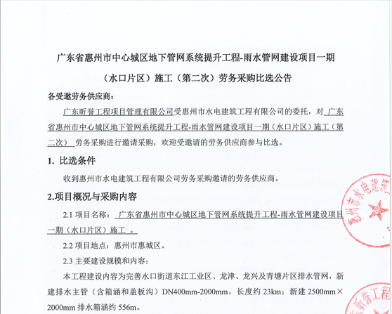 廣東省惠州市中心城區地下管網系統提升工程-雨水管網建設項目一期(水口片區)施工(第二次)勞務采購比選公告......