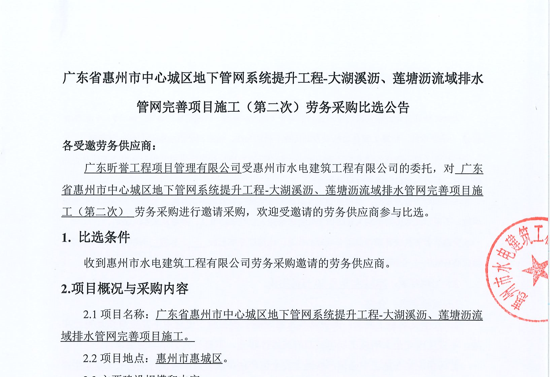 廣東省惠州市中心城區地下管網系統提升工程-大湖溪瀝、蓮塘瀝流域排水管網完善項目施工(第二次)勞務采購比選公告......