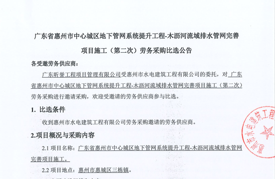 廣東省惠州市中心城區地下管網系統提升工程-木瀝河流域排水管網完善項目施工(第二次)勞務采購比選公告......