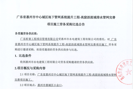 廣東省惠州市中心城區地下管網系統提升工程-高窟瀝流域排水管網完善項目施工勞務采購比選公告......
