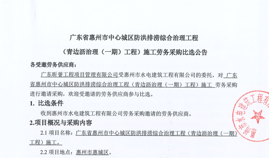 廣東省惠州市中心城區防洪排澇綜合治理工程(青邊瀝治理(一期)工程)施工勞務采購比選公告......