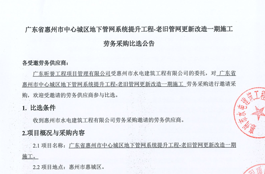 廣東省惠州市中心城區地下管網系統提升工程-老舊管網更新改造一期施工勞務采購比選公告......