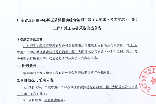 廣東省惠州市中心城區防洪排澇綜合治理工程(大湖溪水及其支流(一期)工程)施工勞務采購比選公告......
