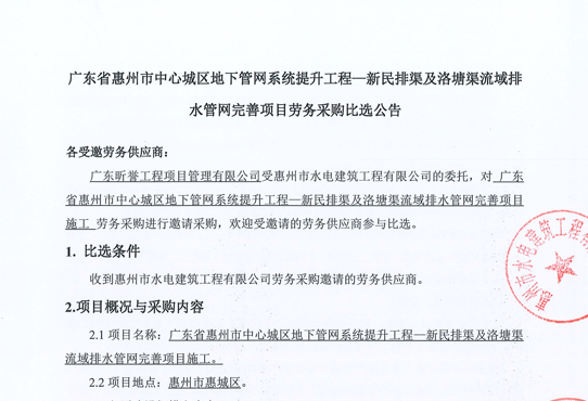 廣東省惠州市中心城區地下管網系統提升工程—新民排渠及洛塘渠流域排水管網完善項目勞務采購比選公告......