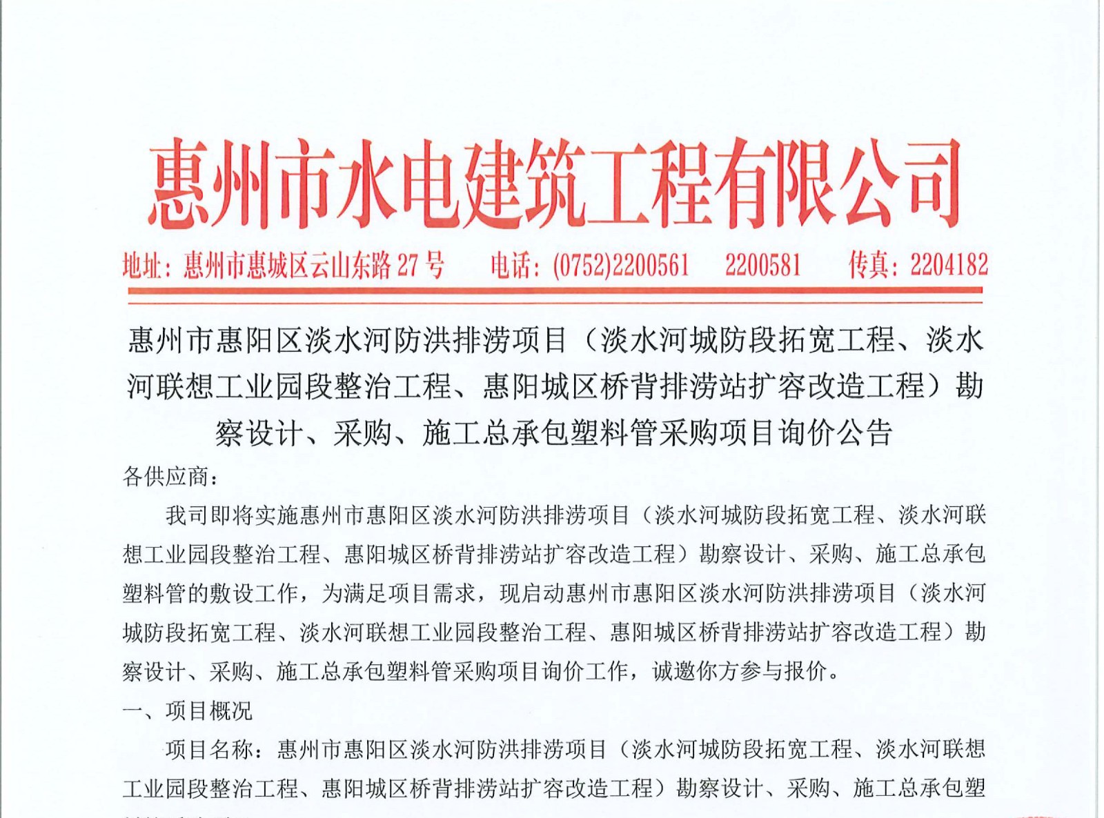 附件:惠州市惠陽區淡水河防洪排澇項目(淡水河城防段拓寬工程、淡水河聯想工業園段整治工程、惠陽城區橋背排澇站擴容改造工程) 勘察設計、采購、施工總承包塑料管采購項目詢價報價表......