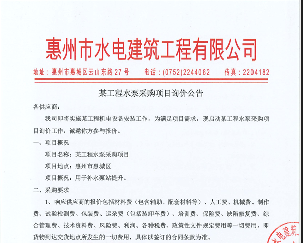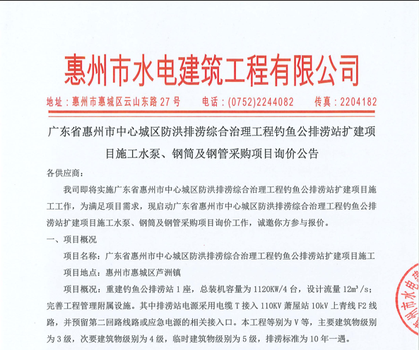 廣東省惠州市中心城區防洪排澇綜合治理工程釣魚公排澇站擴建項目施工水泵、鋼筒及鋼管采購項目詢價公告......
