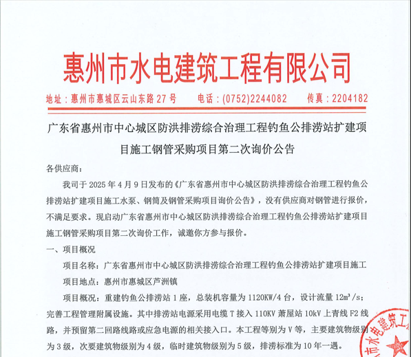 廣東省惠州市中心城區防洪排澇綜合治理工程釣魚公排澇站擴建項目施工鋼管采購項目第二次詢價公告......