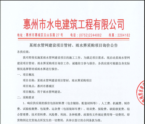 某雨水管網建設項目管材、雨水箅采購項目詢價公告......