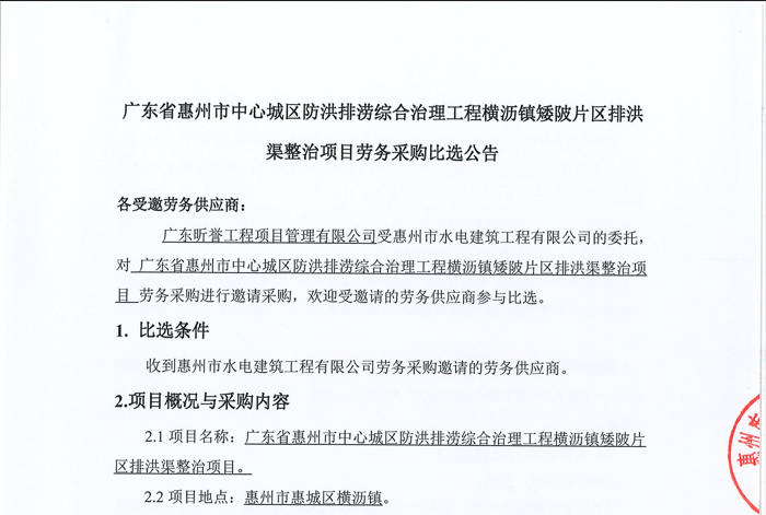 廣東省惠州市中心城區防洪排澇綜合治理工程橫瀝鎮矮陂片區排洪渠整治項目勞務采購比選公告......
