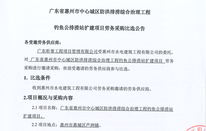 廣東省惠州市中心城區防洪排澇綜合治理工程釣魚公排澇站擴建項目勞務采購比選公告......