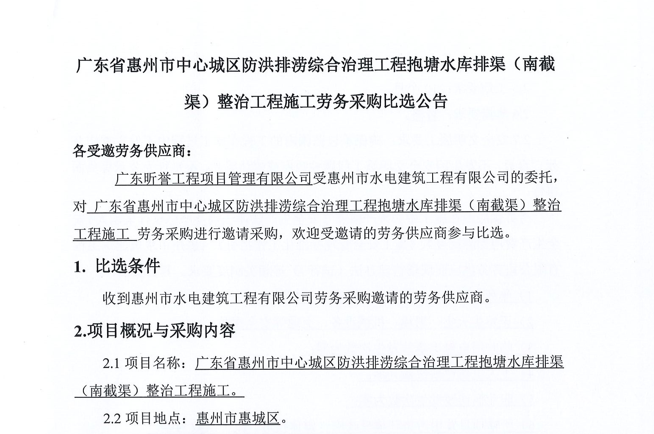 廣東省惠州市中心城區防洪排澇綜合治理工程抱塘水庫排渠(南截渠)整治工程施工勞務采購比選公告......