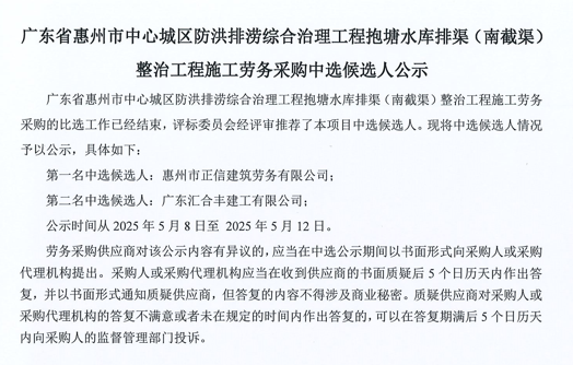 廣東省惠州市中心城區防洪排澇綜合治理工程抱塘水庫排渠(南截渠)整治工程施工勞務采購中選候選人公示......