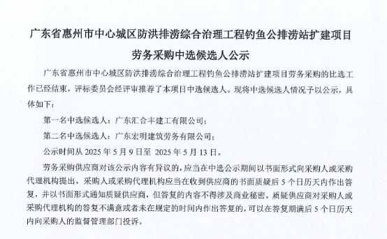 廣東省惠州市中心城區防洪排澇綜合治理工程釣魚公排澇站擴建項目勞務采購中選候選人公示......
