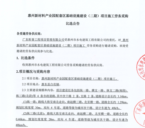惠州新材料產業園配套區基礎設施建設(二期)項目施工勞務采購比選公告......