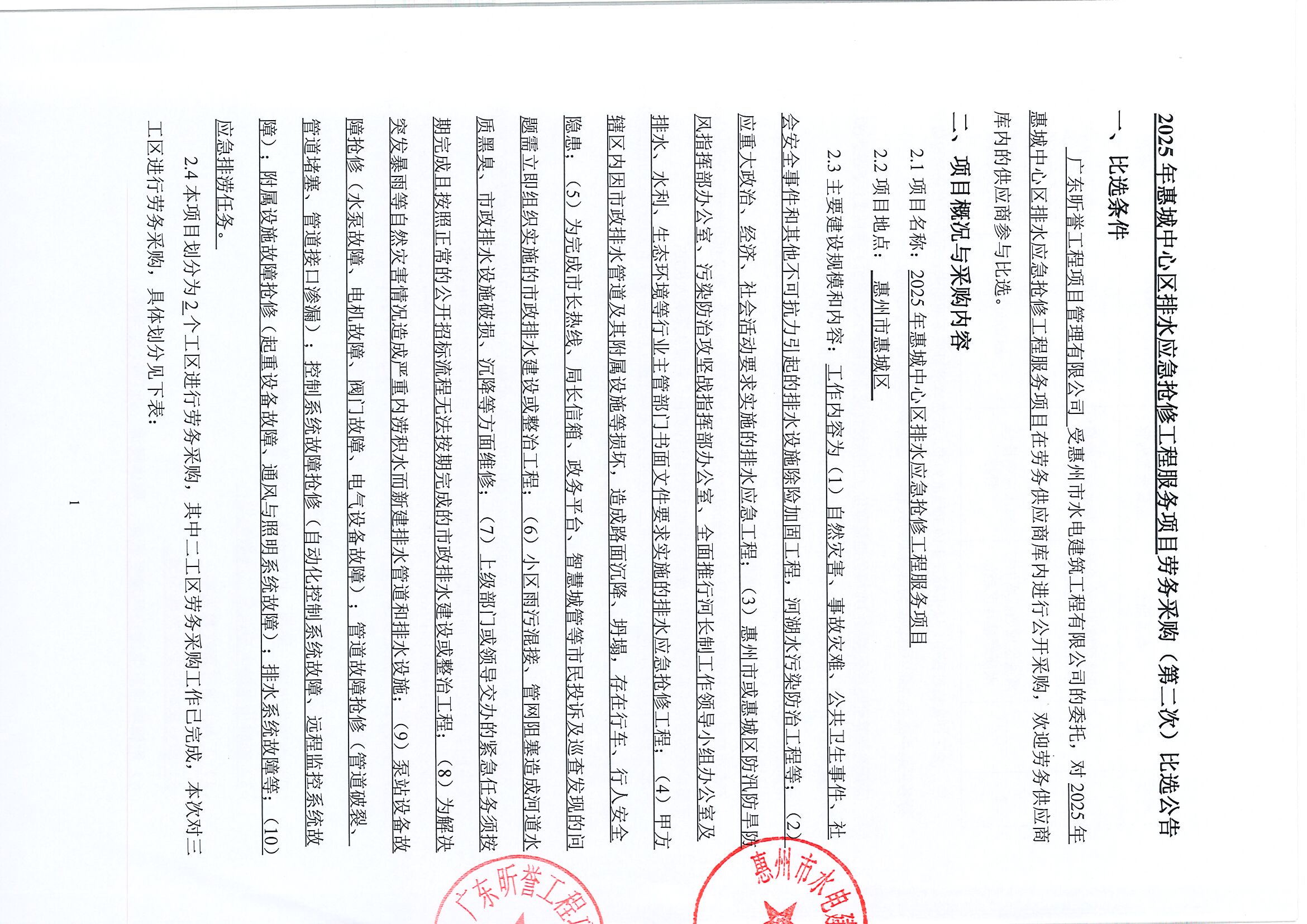 2025年惠城中心區排水應急搶修工程服務項目勞務采購(第二次)比選公告