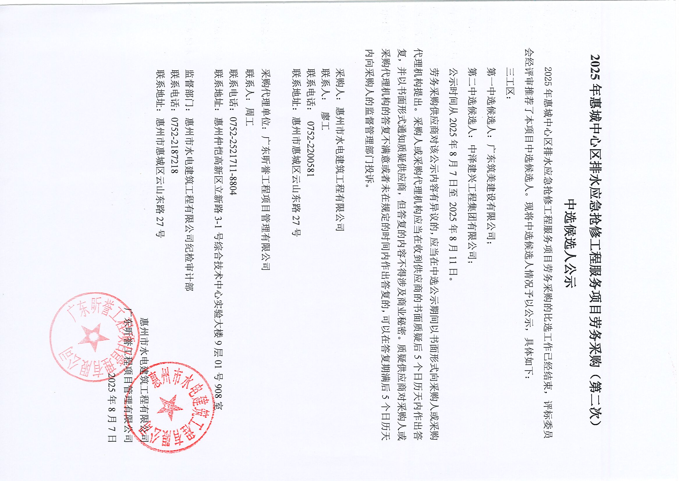 2025年惠城中心區排水應急搶修工程服務項目勞務采購(第二次)中選候選人公示