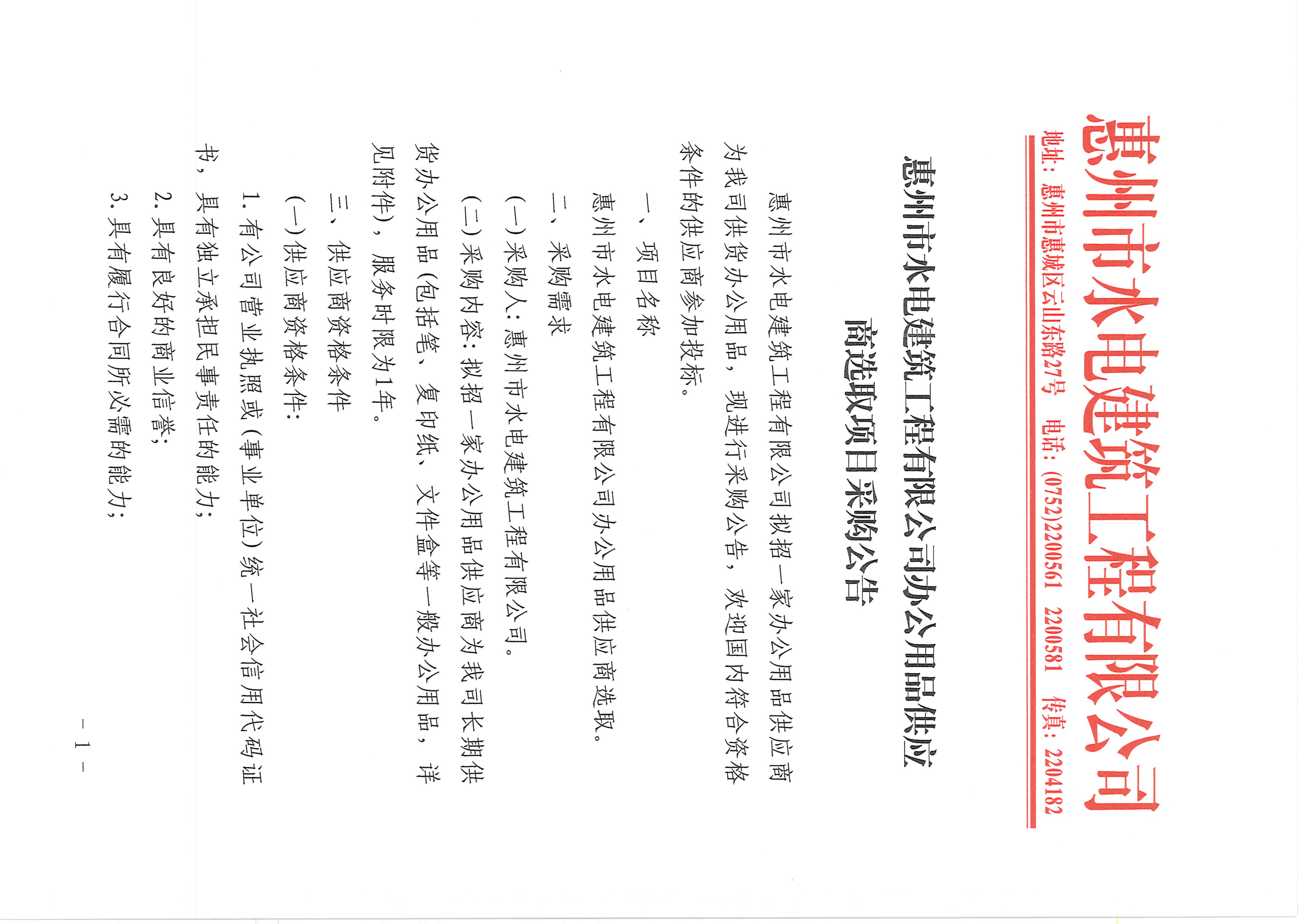 惠州市水電建筑工程有限公司辦公用品供應商選取項目采購公告附件: