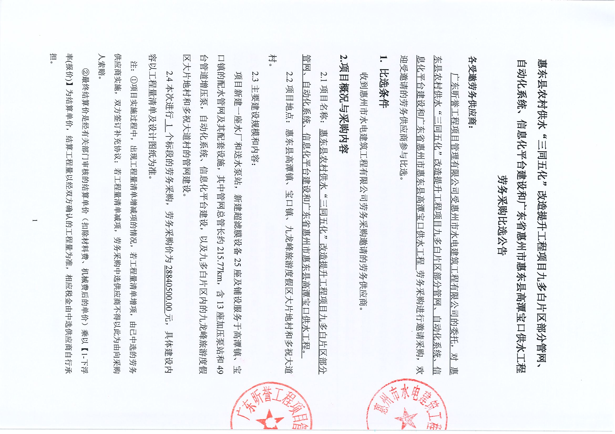 惠東縣農村供水“三同五化”改造提升工程項目九多白片區部分管網、自動化系統、信息化平臺建設和廣東省惠州市惠東縣高潭寶口供水工程 勞務采購比選公告