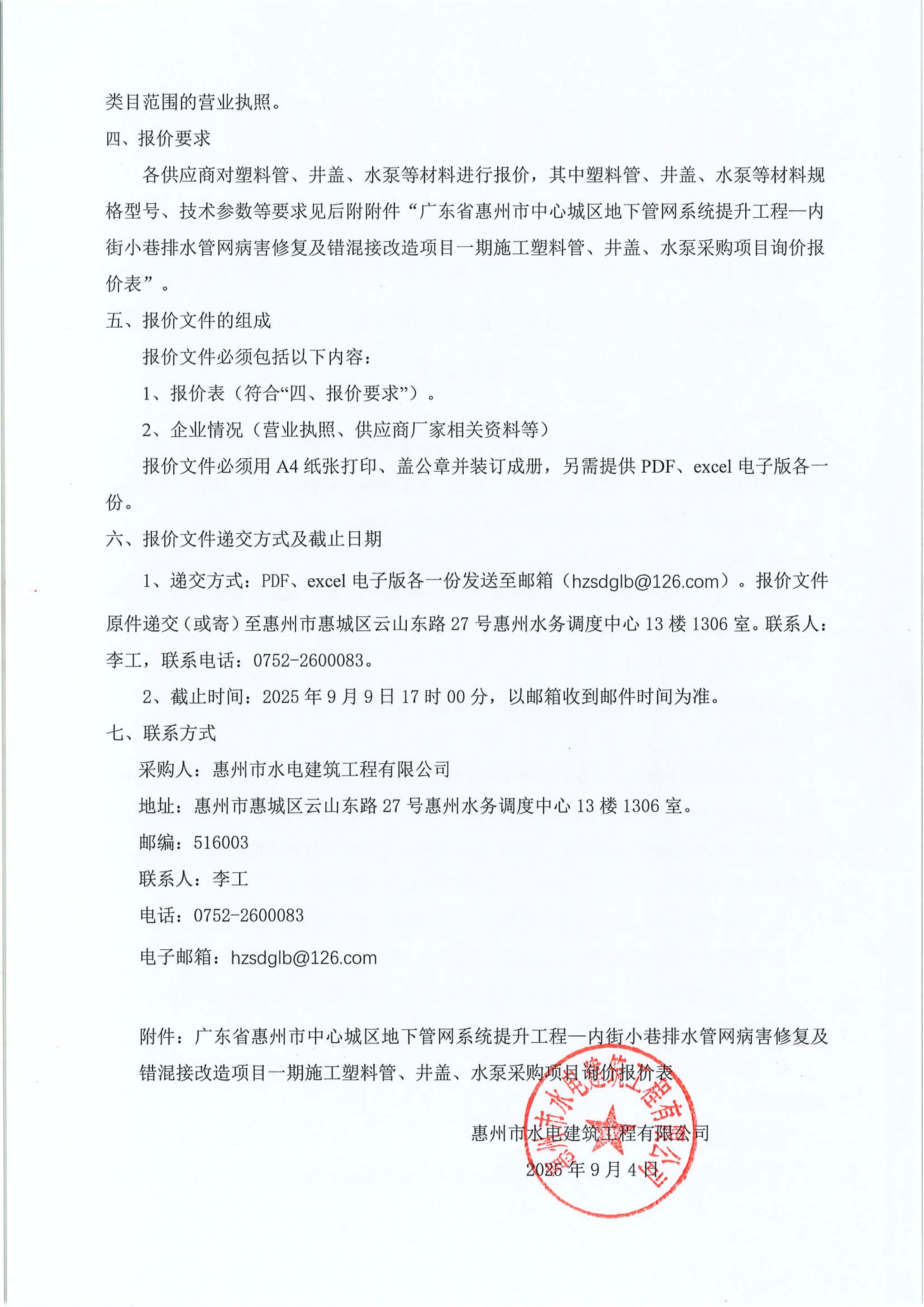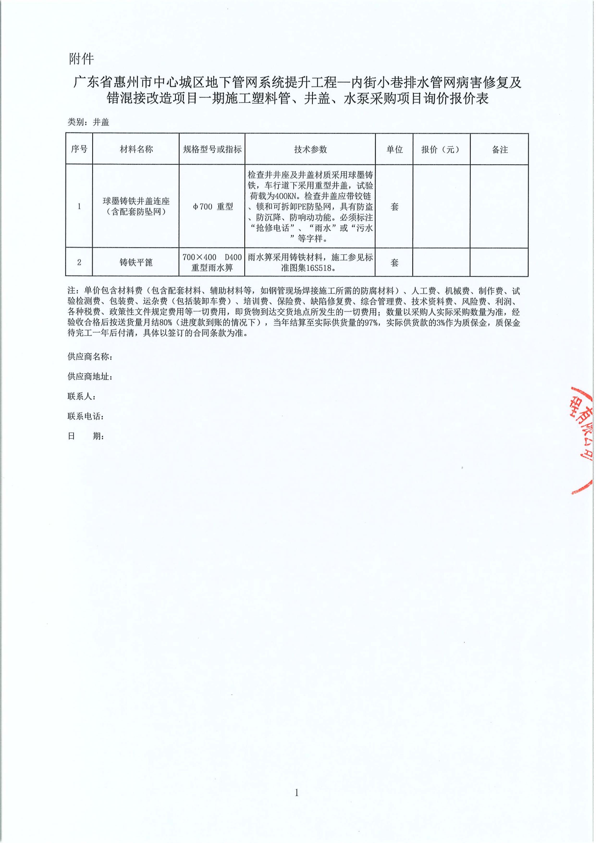 廣東省惠州市中心城區(qū)地下管網(wǎng)系統(tǒng)提升工程—內(nèi)街小巷排水管網(wǎng)病害修復(fù)及錯混接改造項目一期施工塑料管、井蓋、水泵采購項目詢價公告附件: