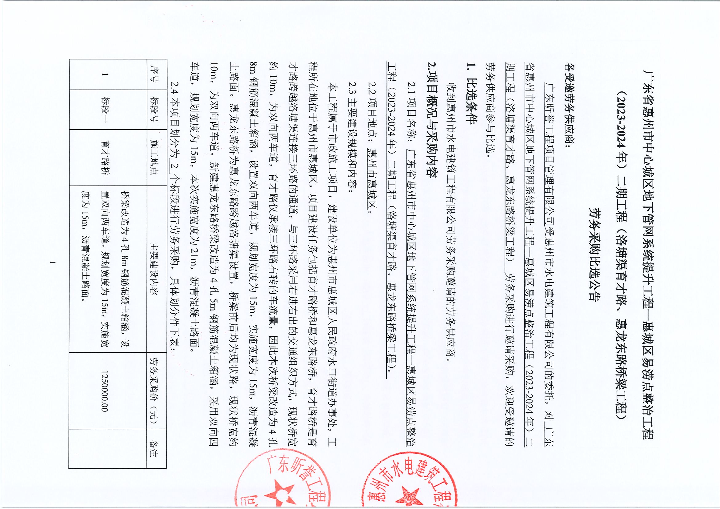 廣東省惠州市中心城區地下管網系統提升工程—惠城區易澇點整治工程(2023-2024年)二期工程(洛塘渠育才路、惠龍東路橋梁工程) 勞務采購比選公告