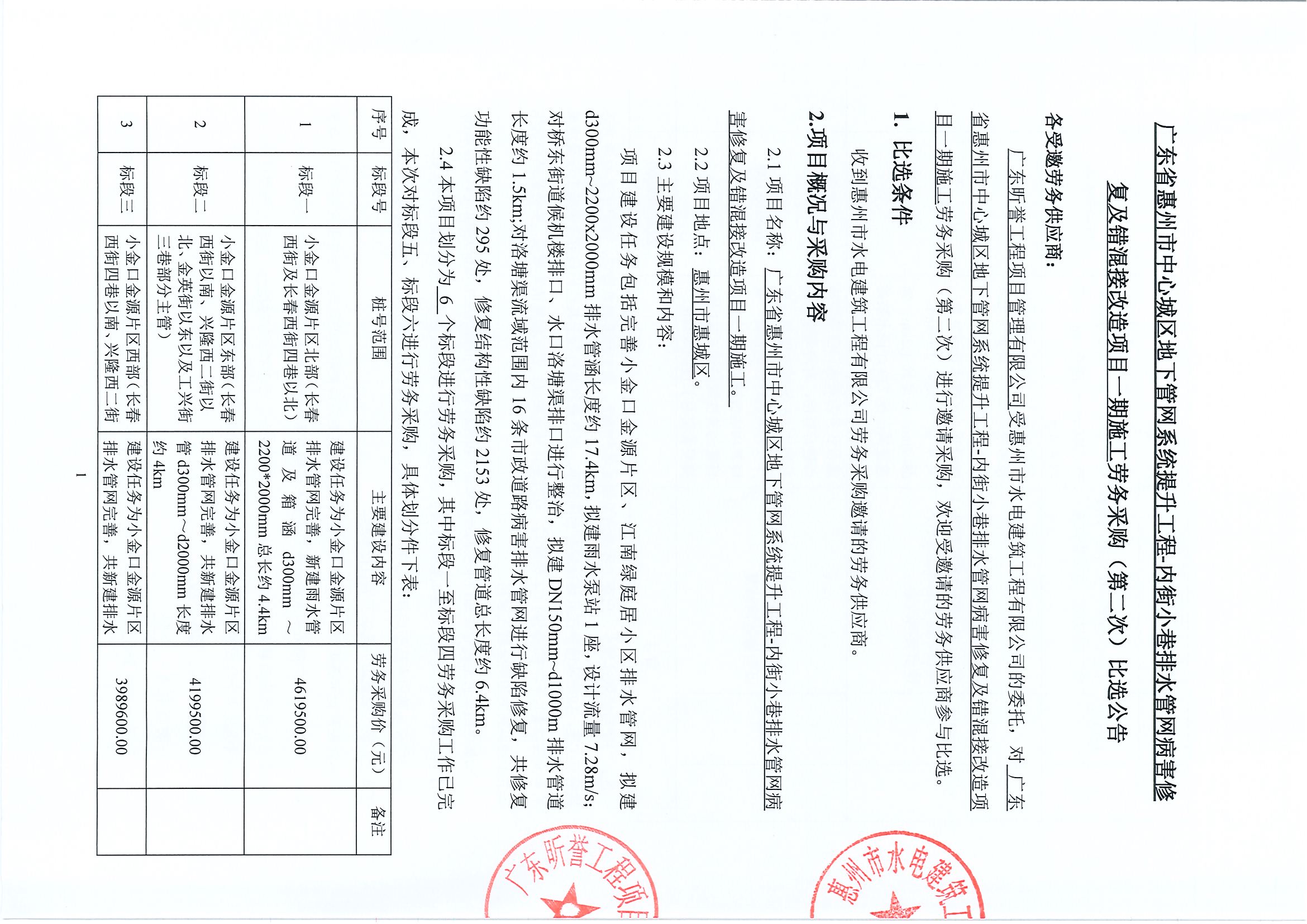 廣東省惠州市中心城區地下管網系統提升工程-內街小巷排水管網病害修復及錯混接改造項目一期施工勞務采購(第二次)比選公告