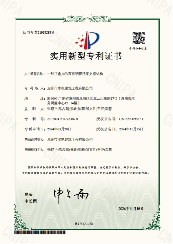 近日,由我司自主研發的“一種可疊加的雙拼鋼管托梁支撐結構”獲國家知識產權局授予實用新型專利證書,標志著公司在創新發展的道路上又向前邁進堅實一步。......
